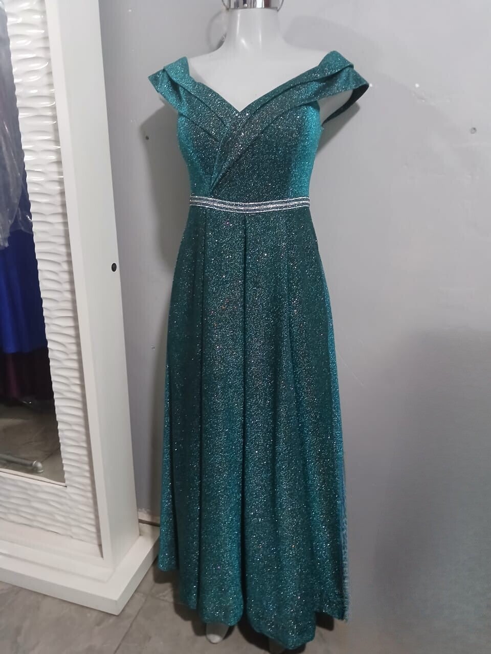 RENTA DE ELEGANTE VESTIDO EN COLOR VERDE ESCARCHADO TALLA M